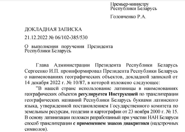 Опубликованная докладная записка датированная 14 декабря. Судя по документу, после его получения, 16 декабря, Александр Лукашенко подписал поручение № 10/87. Оно предписывает госорганам исключить использование латиницы.