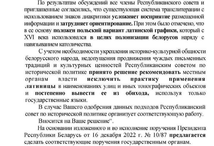Использование латиницы обсуждали 8 декабря на заседании Республиканского совета по исторической политике. Решения, принятые на заседании, не публиковали. Согласно опубликованному сейчас документу, после заседания совета глава Администрации президента Игорь Сергеенко направил Александру Лукашенко докладную записку, где изложил проблему.