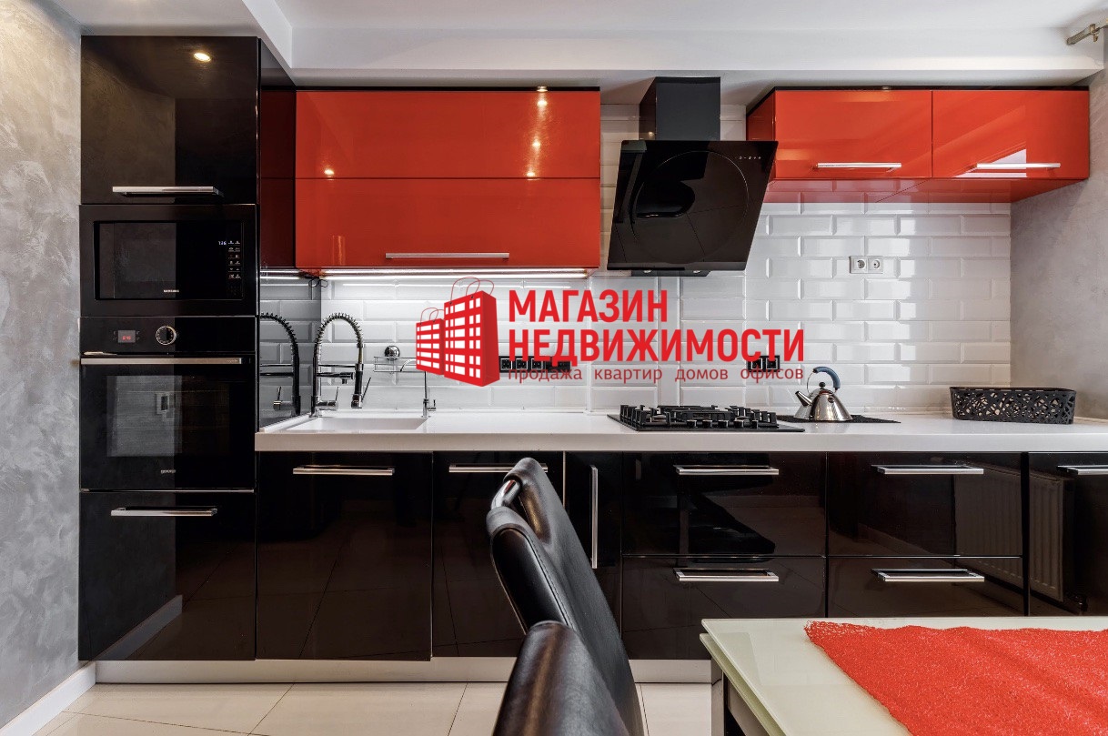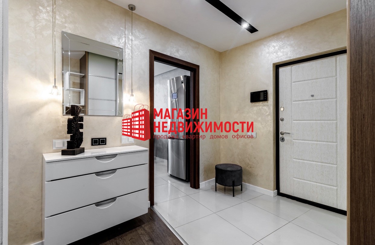 Продается трехкомнатная квартира на ул. Белые Росы, 79. В ней сделан дизайнерский ремонт. В зале установили электрокамин и большой диван. “Акцентная цветовая гамма в интерьере, качественные и дорогие материалы отделки квартиры”, — обещают продавцы.