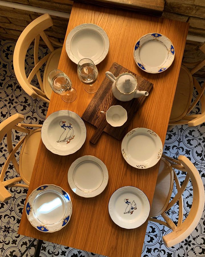 Соавтором интерьеров была дизайнерка Александра Севастынович. Внутри сохранили стены из характерного гродненского желтого кирпича, пол оформили узорчатой плиткой. В оформлении много синего на контрасте с белым, на потолке — большое зеркало в резной золоченой раме и люстра с подвесками.