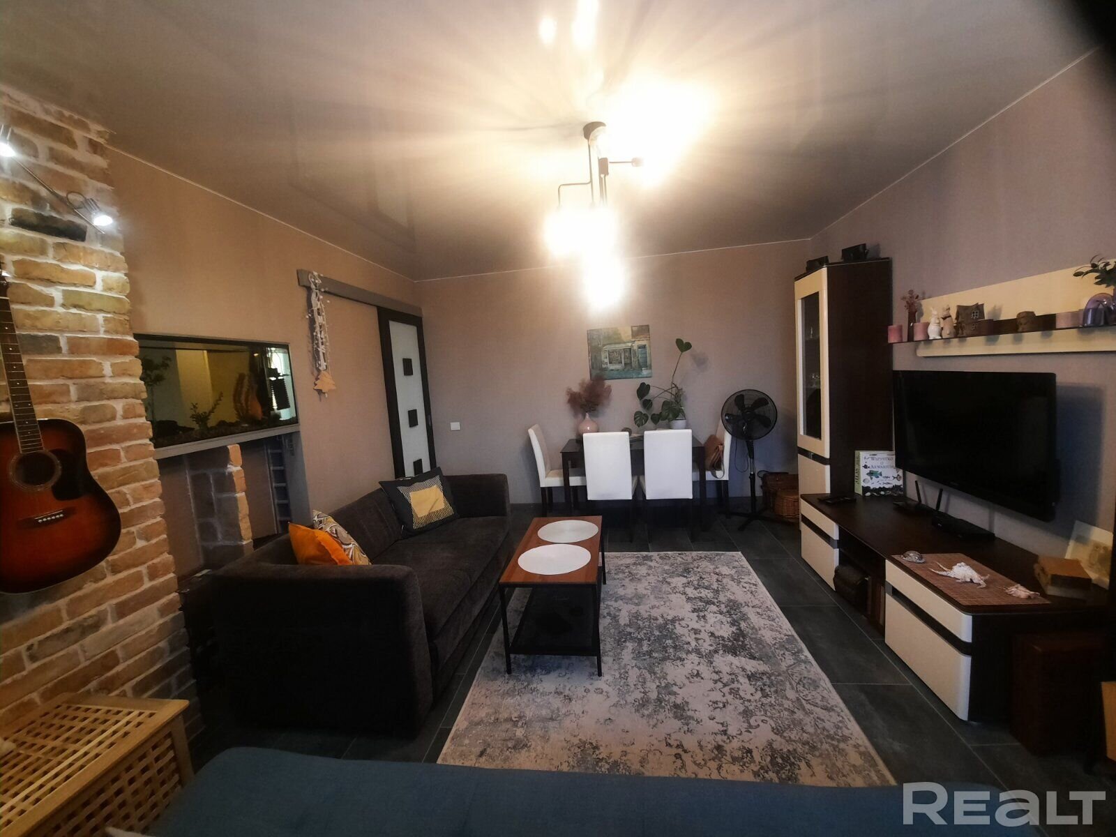В зале расположены два стола, два дивана и много деталей вроде картин и гитар на стене. Преобладают темные и контрастные цвета.