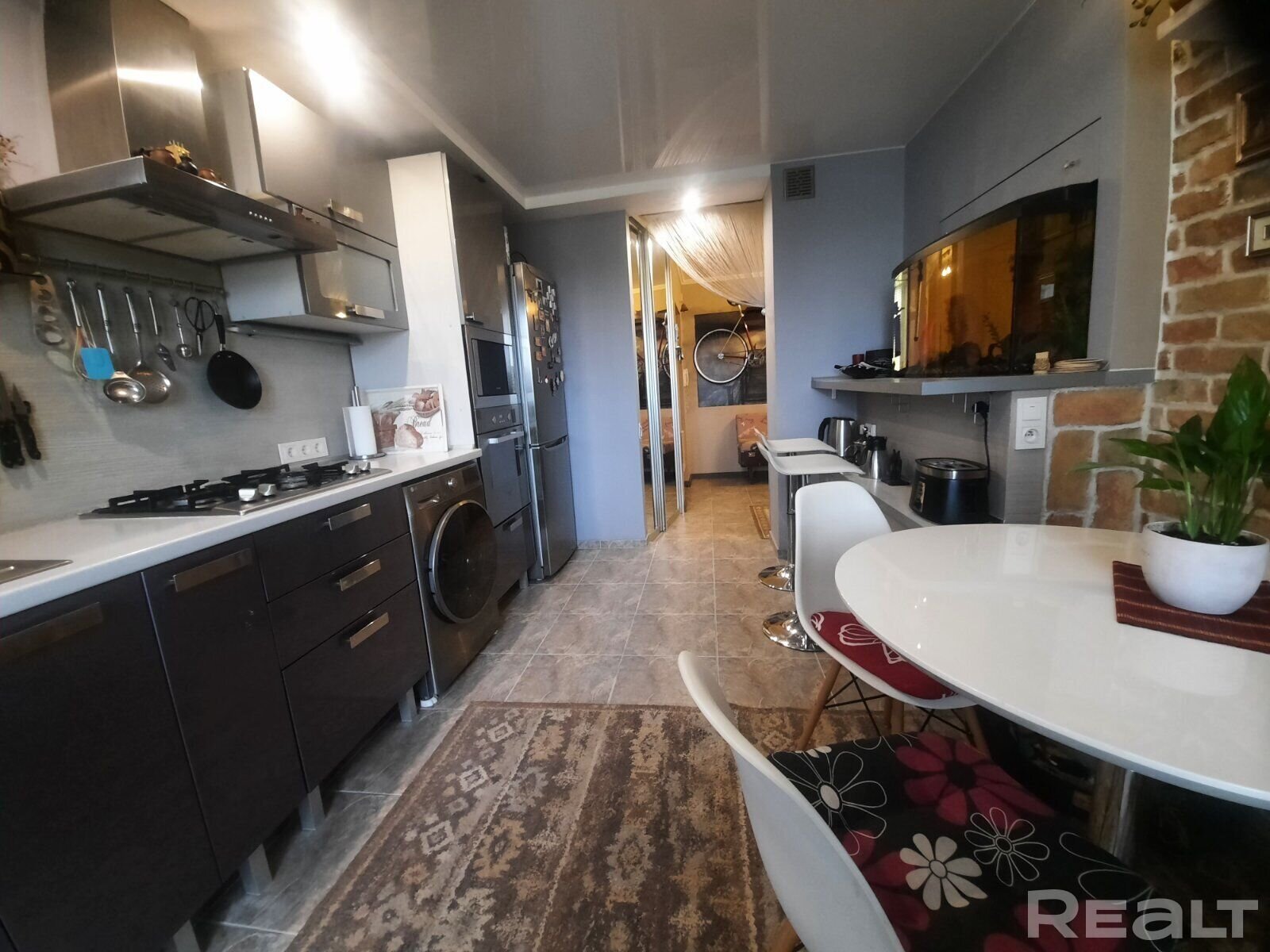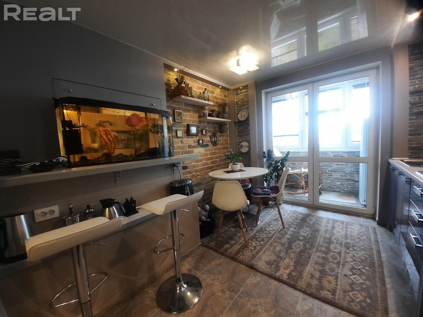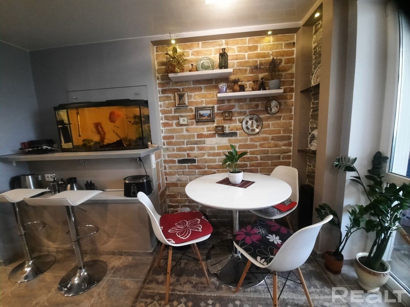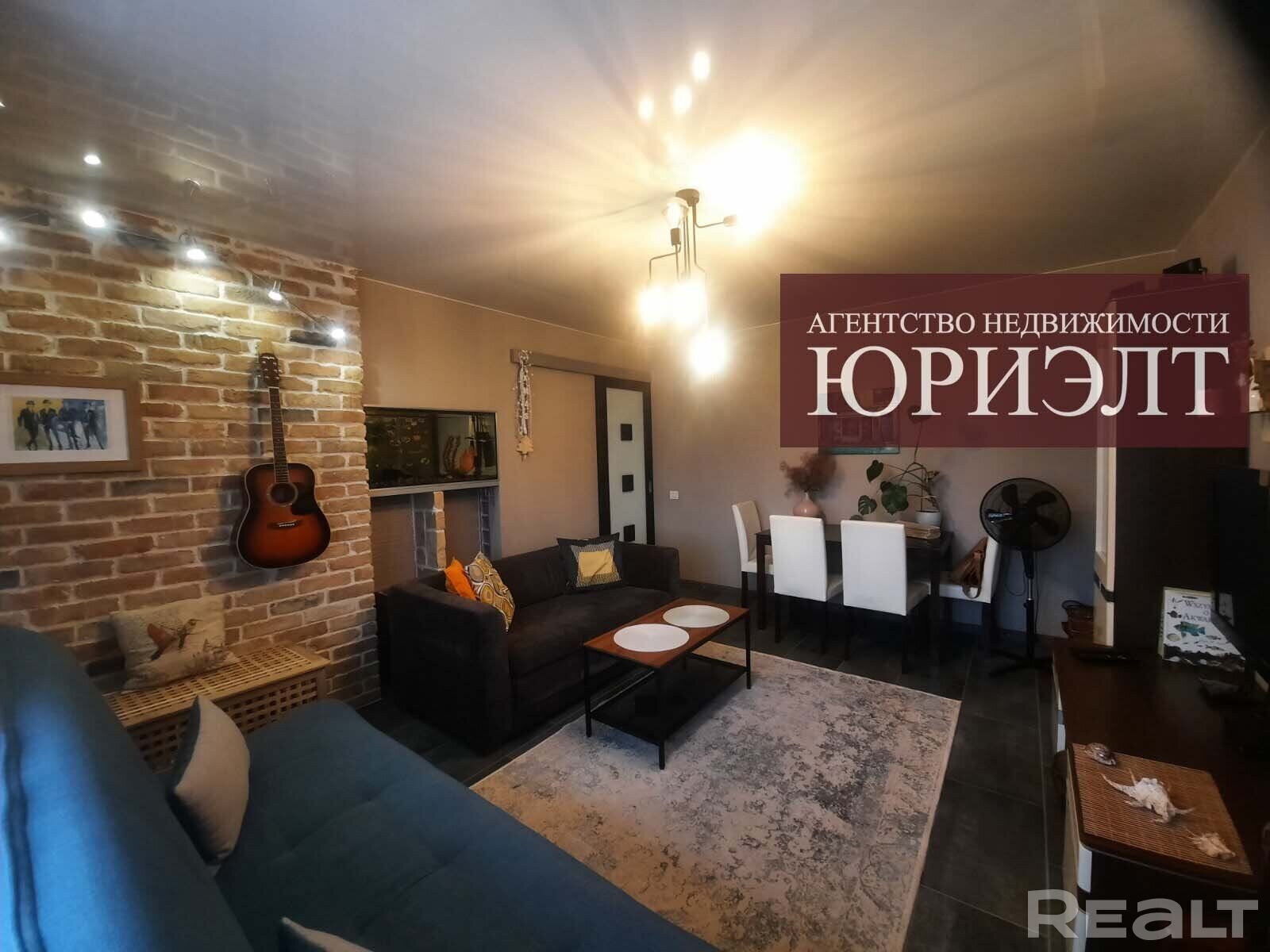 Двухкомнатная квартира по ул. Лиможа, 23а продается в Гродно. При ремонте в ней использовали декоративный кирпич. Купить квартиру можно с мебелью и техникой. В санузле здесь есть разноуровневая подсветка, а на кухне — барная стойка и окно в пол.