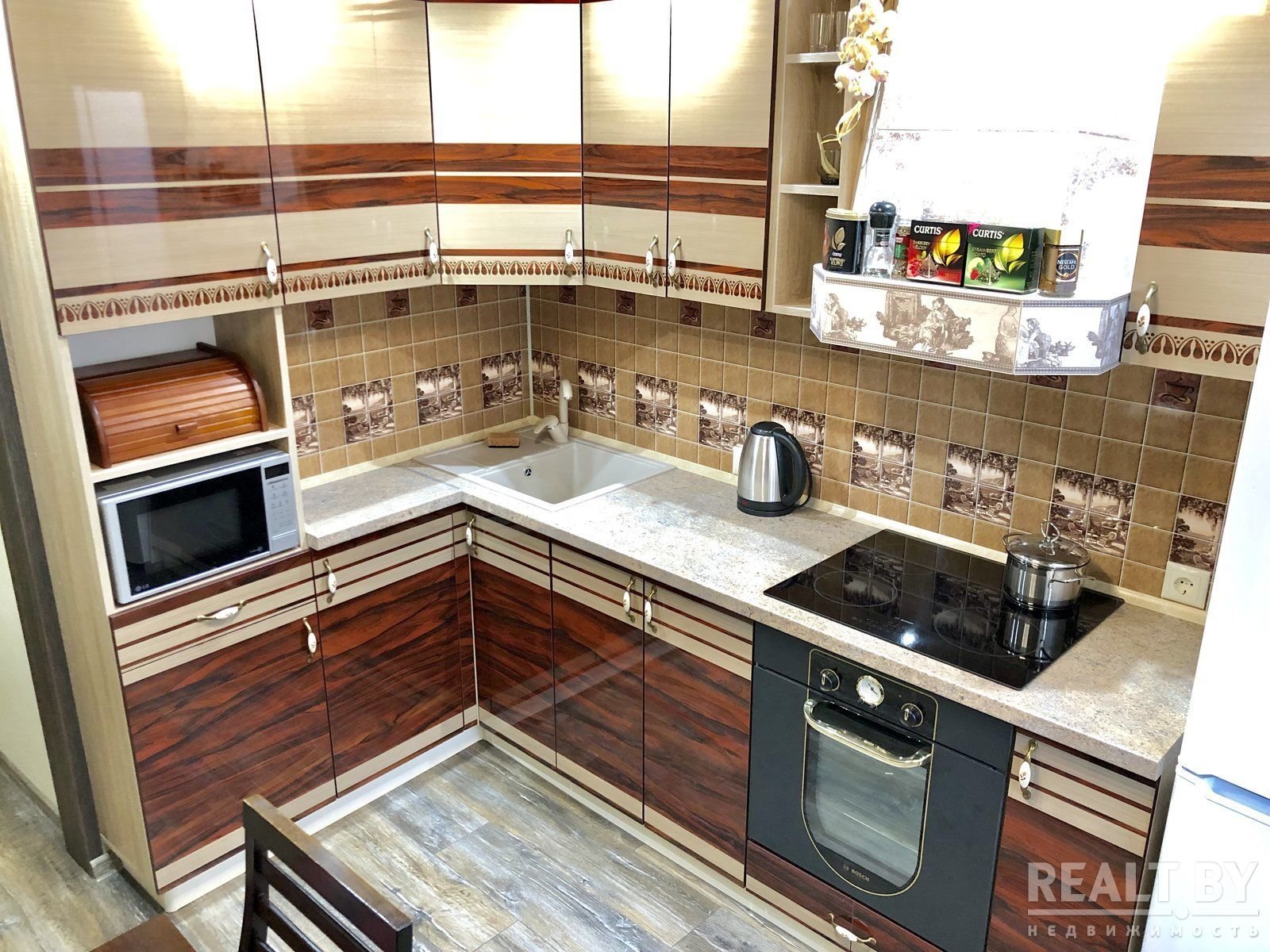 В прихожей разместили шкаф-купе с зеркальной поверхностью, шкаф и комод из темного дерева. На кухне использовали бежевые и бордовые цвета.