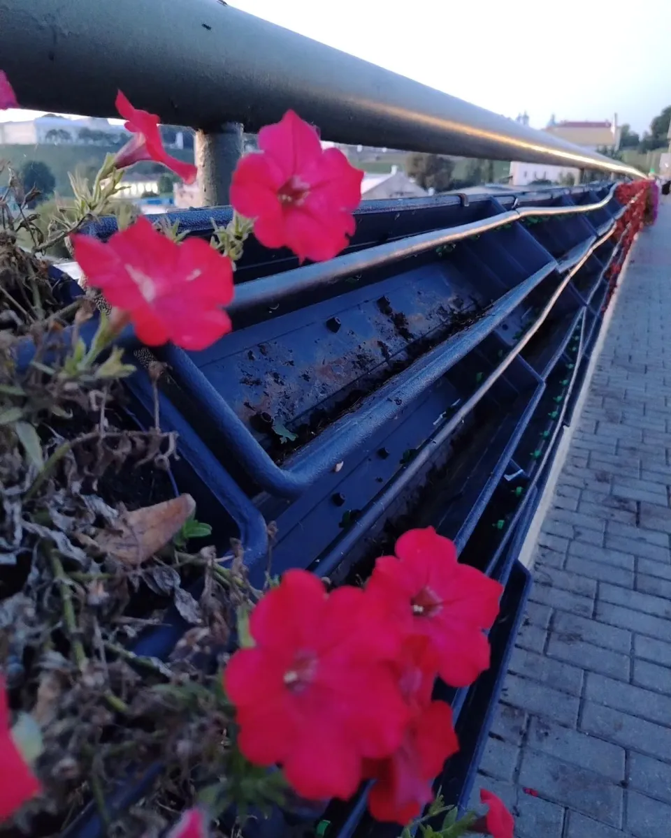 Цветочные стены из петуний в Гродно реализовали на ограде парка Жилибера и на Старом мосту. Чтобы цветы не погибли летом, в конструкцию из цветочных ящиков установили систему капельного полива.