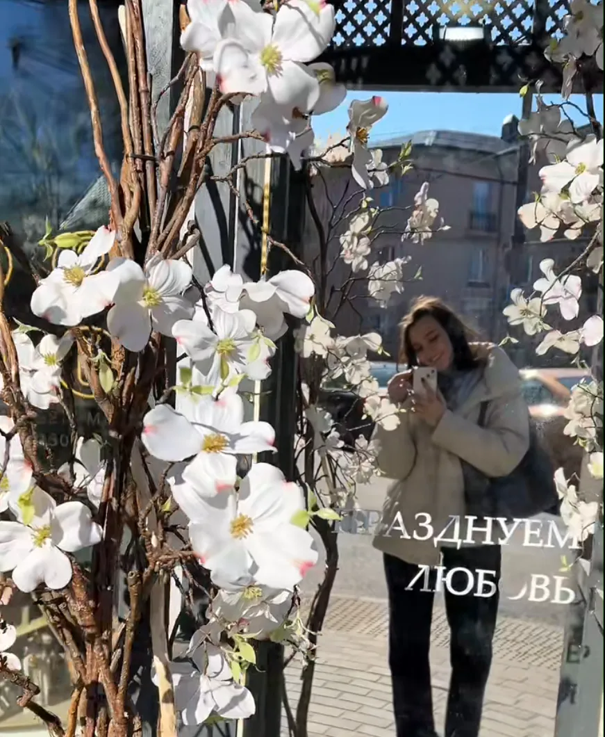Украшения у входа в магазин цветов и декора Angel to Angel на Большой Троицкой уже стали традицией. Сейчас там установили высокую серую конструкцию в виде фонаря или будки, украшенную белыми цветами — похоже, яблони — и лозой. Внутри — зеркало с надписью «Празднуем любовь». Фотозона получилась стильной и нежной.