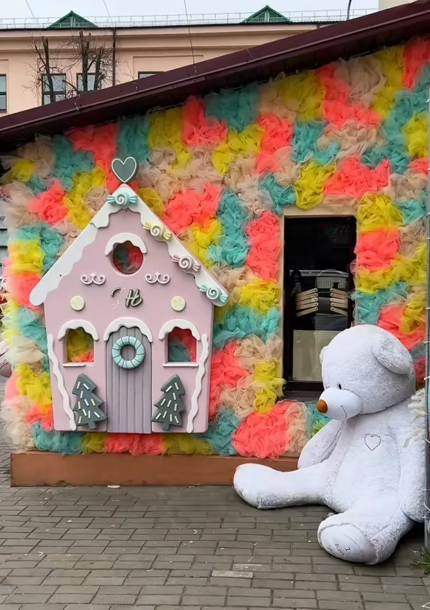 Вся пристройка со входом в магазин сладостей и подарков Jennie.T. Home укрылась под пышными облаками из тюля ярких цветов: розового, жёлтого, бирюзового и кремового. Среди них — декоративные десерты: мороженое, макаруны и ярко-розовый пряничный домик с ёлочками. Рядом, как и зимой, сидит большой белый плюшевый медведь и будто ждет, чтобы с ним кто-нибудь сфотографировался.