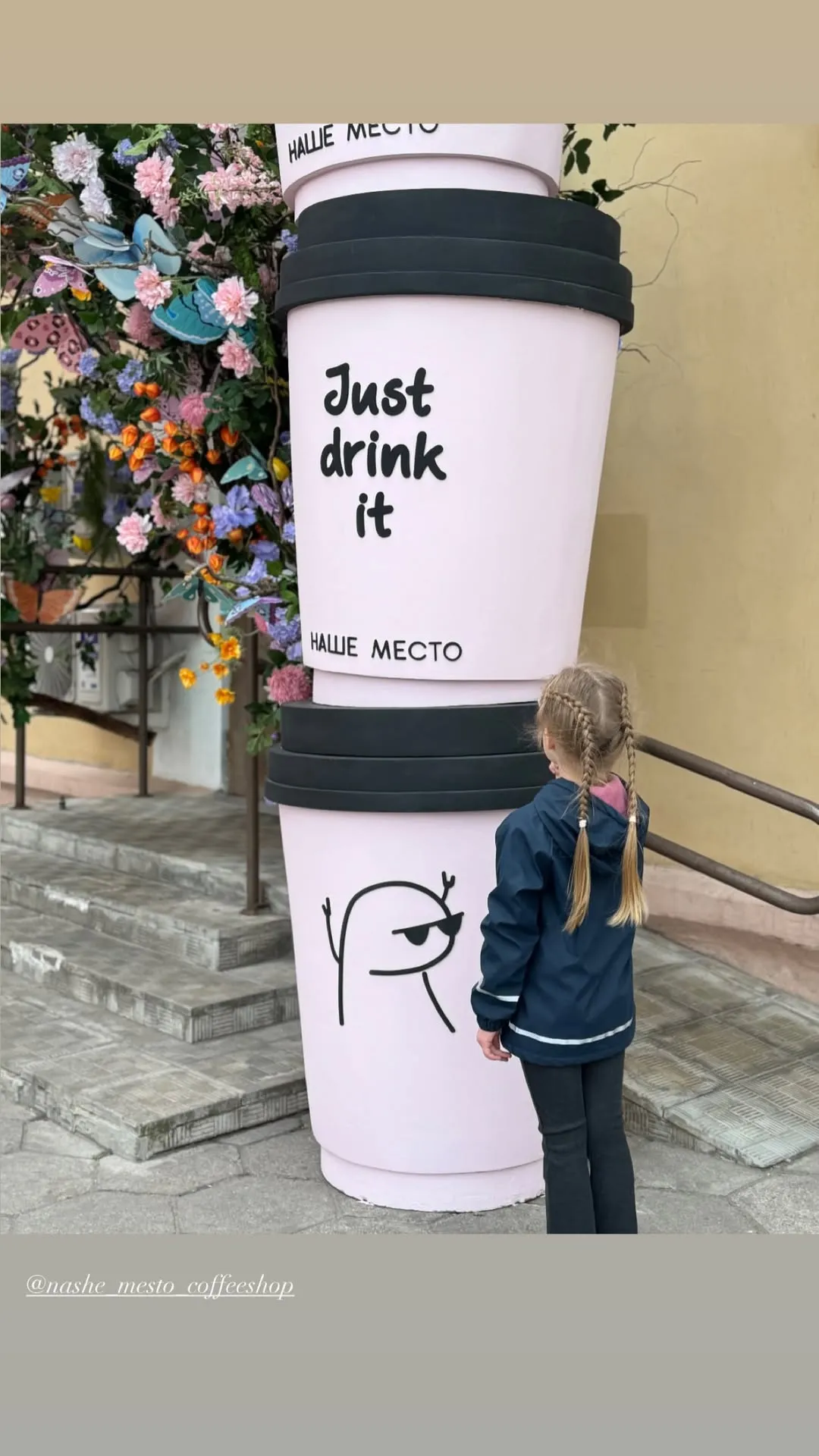 Огромная пышная арка из полевых цветов и бабочек украшает вход в кафе «Наше место» на Дарвина. Рядом поставили три огромных розовых стакана для кофе — композиция заряжает на бодрость. На одном из которых написано: «Just drink it». Контраст яркого декора с нейтральным фасадом здания делает зону особенно фотогеничной.