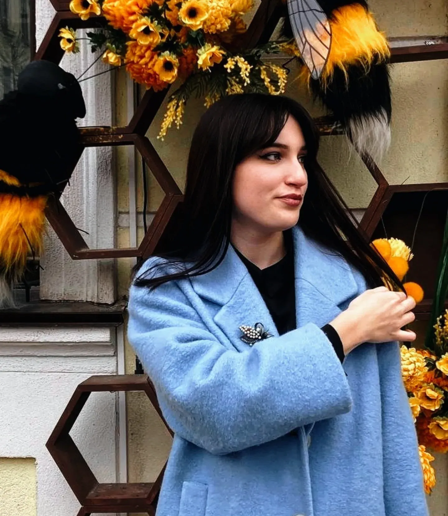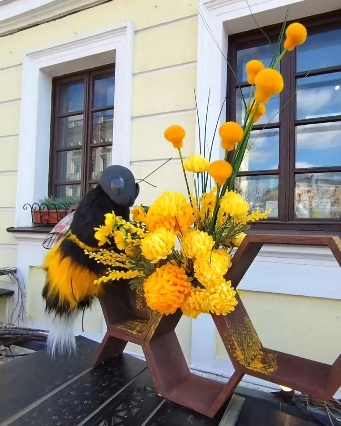 Кафе-пекарня «Прафiтроля» на Советской также традиционно украшает вход со сменой сезонов. Этой весной там появились большая «медовая» инсталляция: коричневая конструкция в виде сот, из которых выглядывают пушистые шмели с крылышками. Между ними — ярко-жёлтые цветы и декоративная пыльца. Композиция создает ассоциации с теплом, сладостями и весенним настроением.
