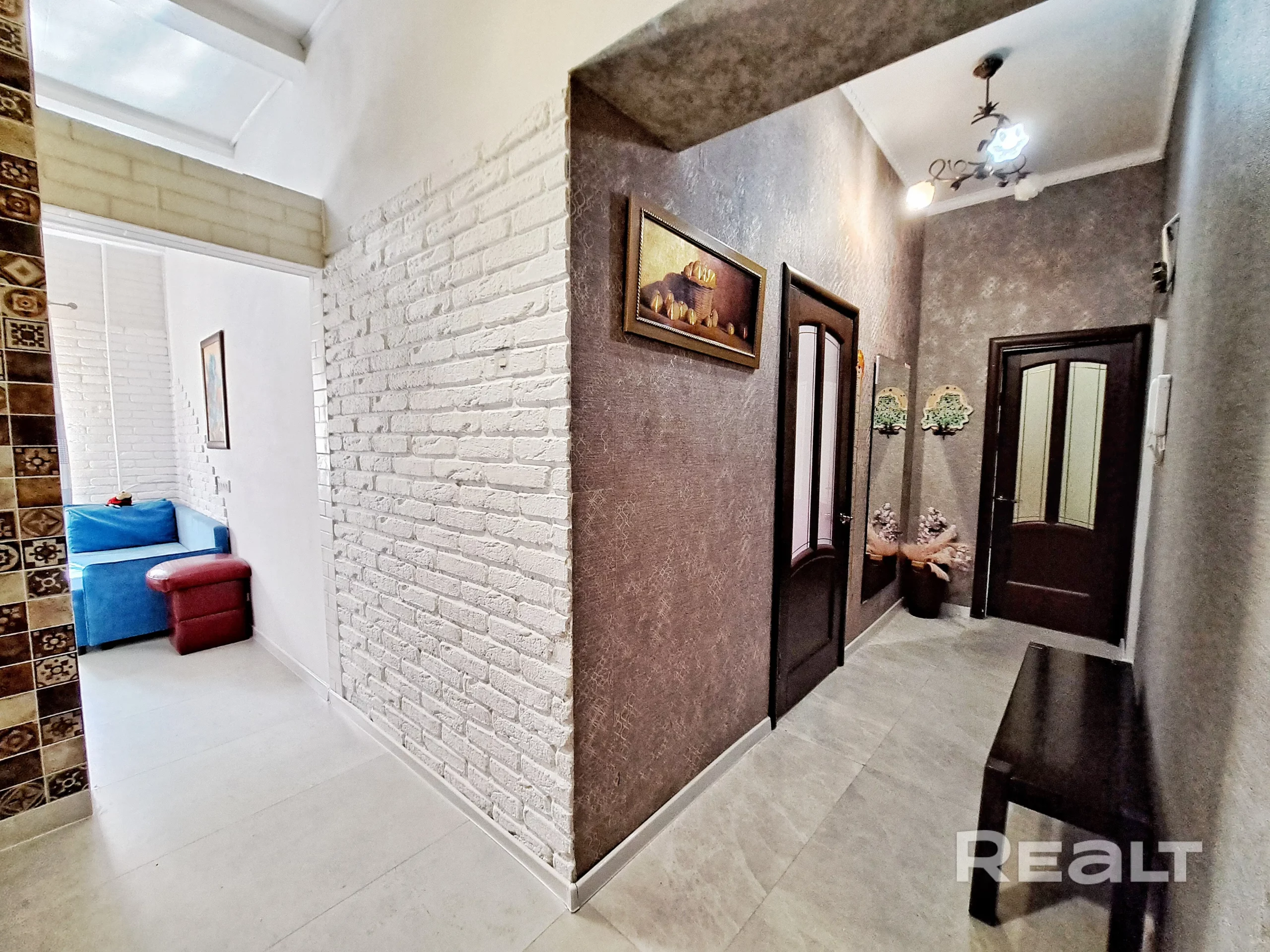 Кухня оформлена в светлые тона с отделкой стен под кирпич. Здесь удобно разместили всю бытовую технику, в том числе стиральную машину. Акцентом стал синий диван. В жилых комнатах мягкий свет, в каждой — по двухспальной кровати, рельефные элементы на потолке и стенах. В квартире аккуратный ремонт и много диванов. Подключены телефон и интернет.