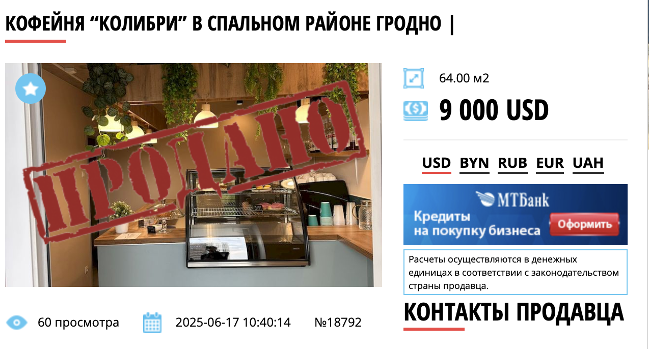 Тем не менее на «Куфар» объявление о продаже «Колибри» до сих пор активно. За кофейню просят 41,7 тыс. ($12,4).