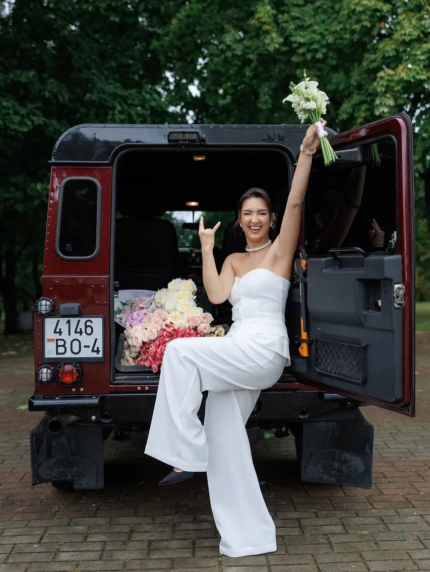 Блогерка отказалась от пышного свадебного платья и фаты, в день бракосочетания она была в белом брючном костюме.
