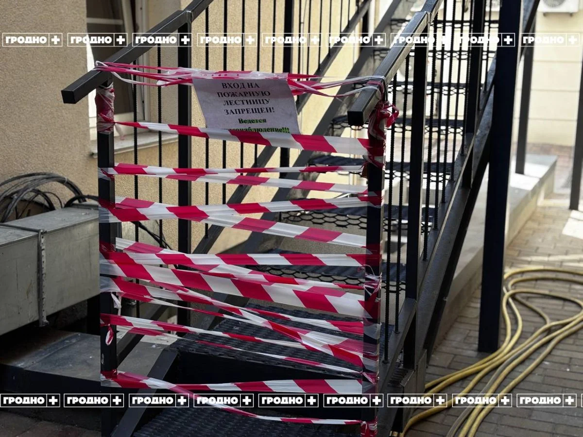 Нижние перила лестницы обмотаны сигнальной лентой, рядом установлена табличка «Вход воспрещен». Также на месте ведется видеонаблюдение, сообщает “Гродно Плюс”.