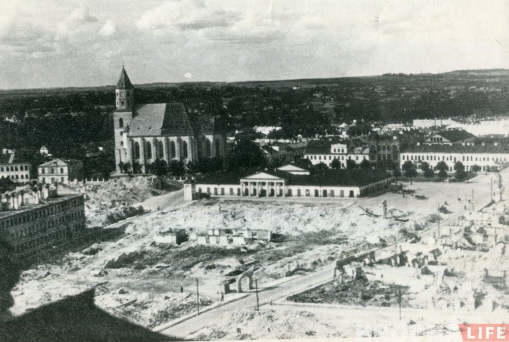 «Сплошные руины были и на месте нынешнего магазина «Баторий» и дальше до ул. Парижской коммуны. Пострадала и Советская улица. Но чем дальше от площади, тем разрушений было меньше. Улица Ожешко пострадала мало. На левом берегу Немана сохранилось почти всё. Развален был хлебозавод и в какой-то степени табачная фабрика. Похоже, что город уничтожался не слепыми бомбёжками и артобстрелами, а подрывами конкретных объектов».
