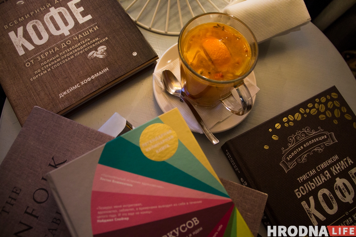 Также у окна лежит стопка немассовых журналов вроде “Культ” и сборник Есенина. Как рассказывает бариста Антон, по большей части это то, что принесли они сами. Книги домой уносить нельзя, но однажды туристка очень просила продать ей два сборника стихотворений белорусских поэтов. Тогда эти сборники ей просто подарили.