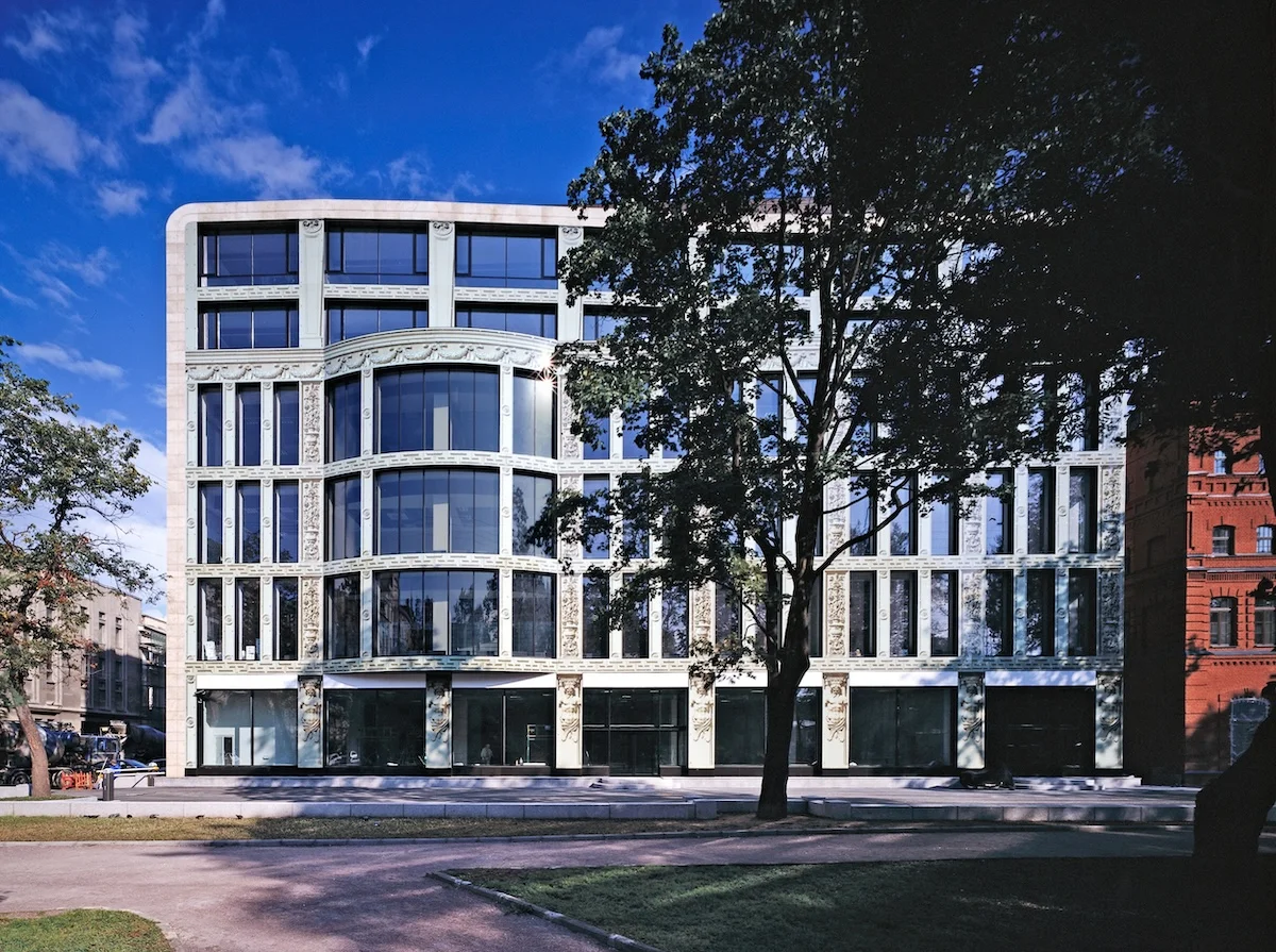 Бывшие промышленные здания в Петербурге реконструировали иначе. Там оставили каркасы, но сделали совсем новые фасады и достроили этажи. Это уже ближе к подходу Семашко, но есть нюанс. Фасады остались плоскими и стеклянными, а декор “под старину” в первом случае и репродукции фрагментов картин во втором нарисованы на стекле методом шелкографии. С гродненским Домом быта бывший цех, а ныне БЦ “Лангензипен” роднит еще и расположение — вдали от улицы, за деревьями и другими зданиями.