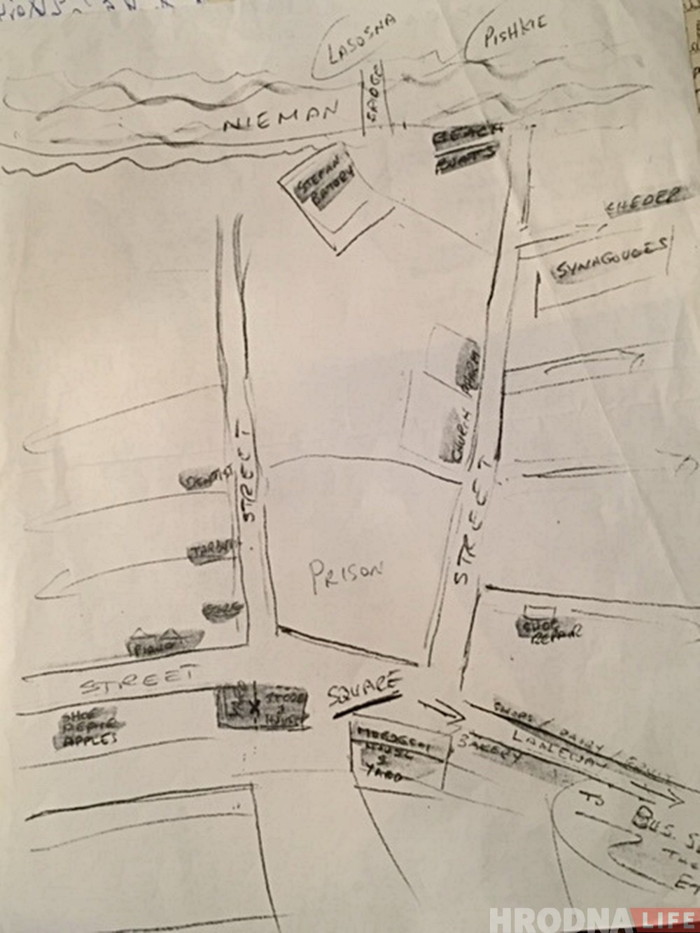 «Семья уехала из Гродно в 1930-х годах, — рассказывает Сэнди. — Уезжали родители и трое их детей, которым было по 11-12 лет. Карту, с которой я приехала, рисовал для потомков мой дядя. На ней изображено примерное место, где жила наша семья. Он рисовал по памяти в 2009 году, незадолго до своей смерти. Делал это в надежде, что кто-нибудь из родственников все же когда-нибудь приедет в Гродно и найдет семейный дом».