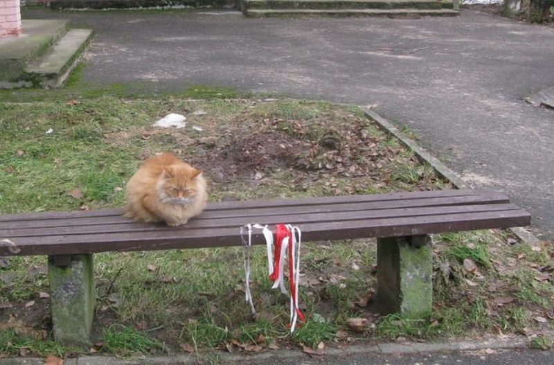 В августе после выборов на скамейке возле одного из домов на проспекте Юности в Мостах жители завязали бело-красно-белые ленты. Символы сначала срезали, но они несколько раз возвращались на место. Вскоре эту скамейку облюбовал большой рыжий кот. Горожане заметили, что он сидит на лавочке почти постоянно, уходит в подвал только в непогоду. Не испугала “демонстранта” даже зима. Кот дежурит возле ленточек уже больше четырех месяцев, пишет Газета Слонимская.