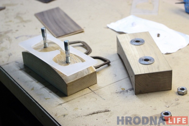 Оправа состоит из девяти слоев шпона, перед склеиванием которых слои отдаются на высокоточную лазерную резку. Это нужно для точного соблюдения размеров и линий дизайна. После этого слои вымачиваются и зажимаются на сутки в специальную форму.