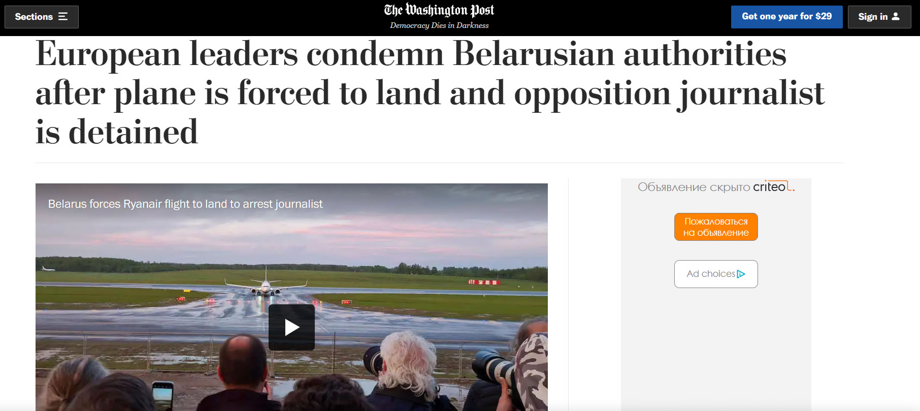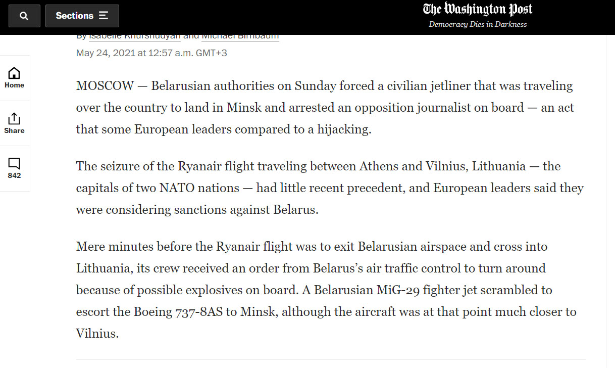 «В воскресенье беларусские власти вынудили гражданский самолет, летевший над страной, приземлиться в Минске и арестовали на борту оппозиционного журналиста — акт, который некоторые европейские лидеры сравнивают с захватом.