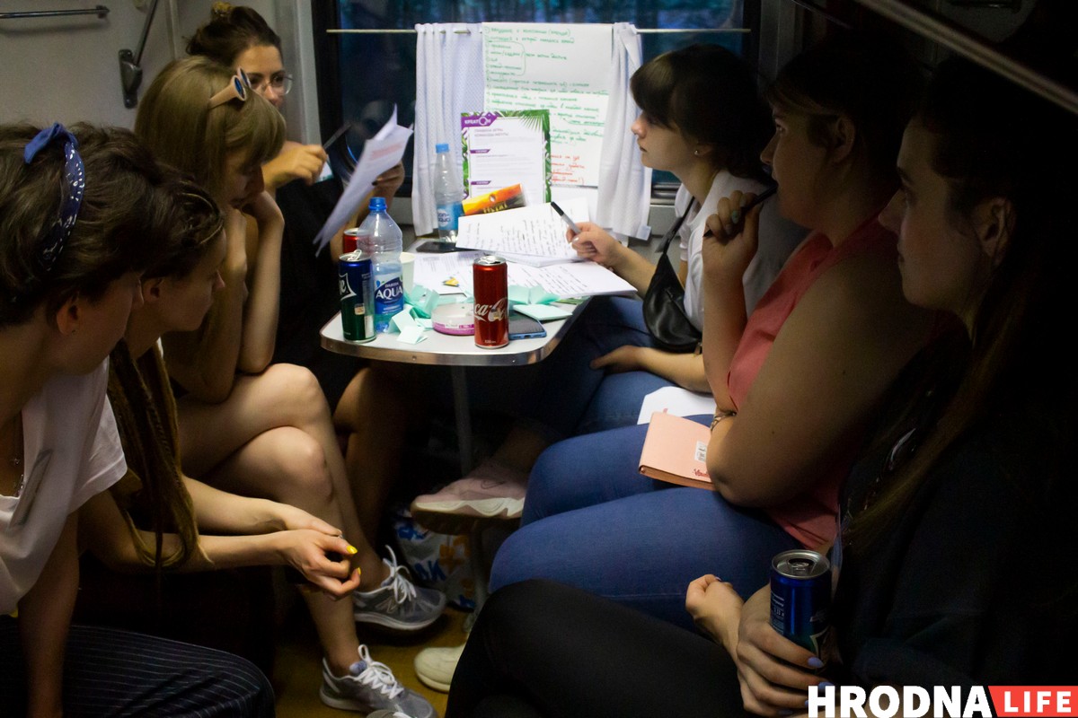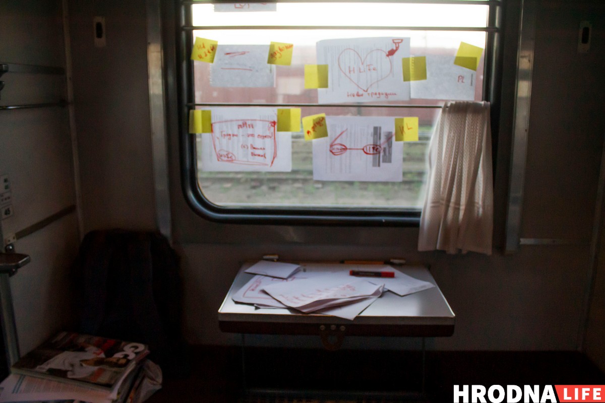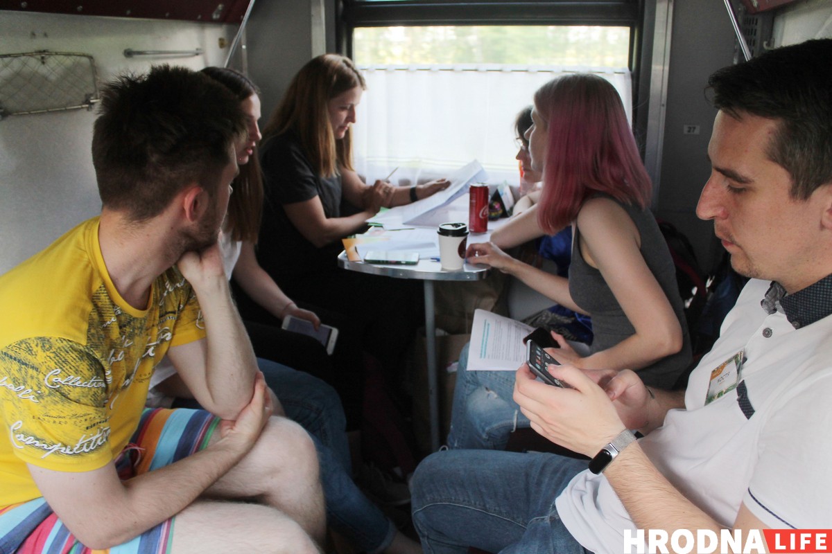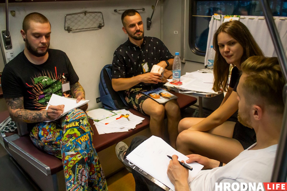 Когда выбирали площадку для пятого Креатона, прозвучало предложение провести его в поезде. Оказалось, Минск-Гродно-Минск — единственный поезд к областному центру, который уже через час едет назад. К тому же это самый медленный поезд, который только удалось найти. Выкупить вагон помогли партнеры. В 15.30 в субботу участники сели на поезд и в 7.20 воскресенья вернулись в столицу.