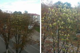 Этой новостью с редакцией «Лідскай газеты» поделилась читательница. «Выглянула в окно квартиры – и ахнула: среди увядающей листвы деревьев красуется, будто праздничный, букет белых цветов, –…