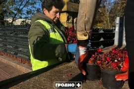 Сотрудники «Гроднозеленстроя» убирают горшки с цветами, чтобы растения не погибли от холодов. Сейчас демонтируют «зеленое ограждение» в парке Жилибера. Зоны с вертикальным озеленением летом…